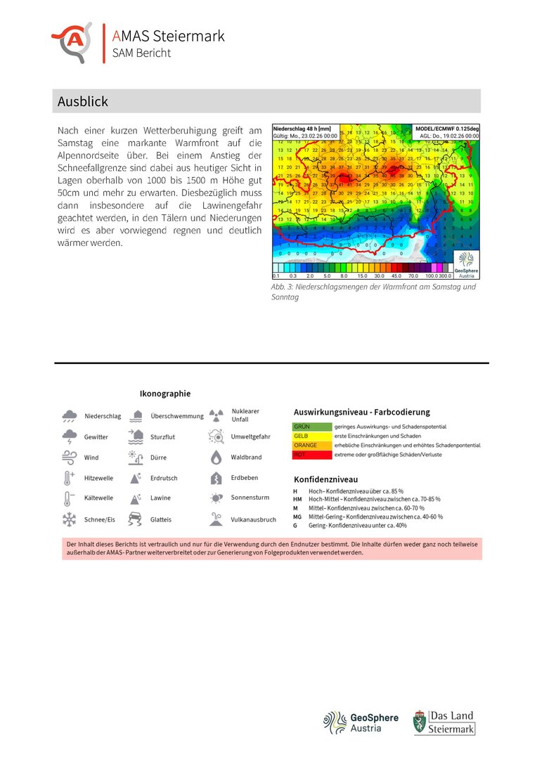 Graz: Der zu erwartende Niederschlag in Kombination mit den sinkenden Temperaturen in den Nachtstunden kann im Stadtgebiet zu Problemen/Einschränkungen führen. Da die temperaturmäßige Lage äußerst knapp erscheint, ist der Übergang zwischen Regen, Schneeregen und (Nass-)Schnee derzeit noch schwer einzuschätzen. Sollte das Worst Case Szenario eintreten [überwiegend (Nass)Schnee] sind Probleme im Frühverkehr, Baum-/Astbruch sowie mögliche Auswirkungen im Bereich der Energieversorgung erwartbar. Sollte der Niederschlag hauptsächlich in Form von Regen fallen, sind keine großflächigen Probleme zu erwarten. Der gefrorene Boden ist bereits aufgetaut und die Dauer des Niederschlags macht keine Problematiken in Punkto Starkregenereignisse und pluviale bzw. fluviale Überschwemmungen erwartbar.