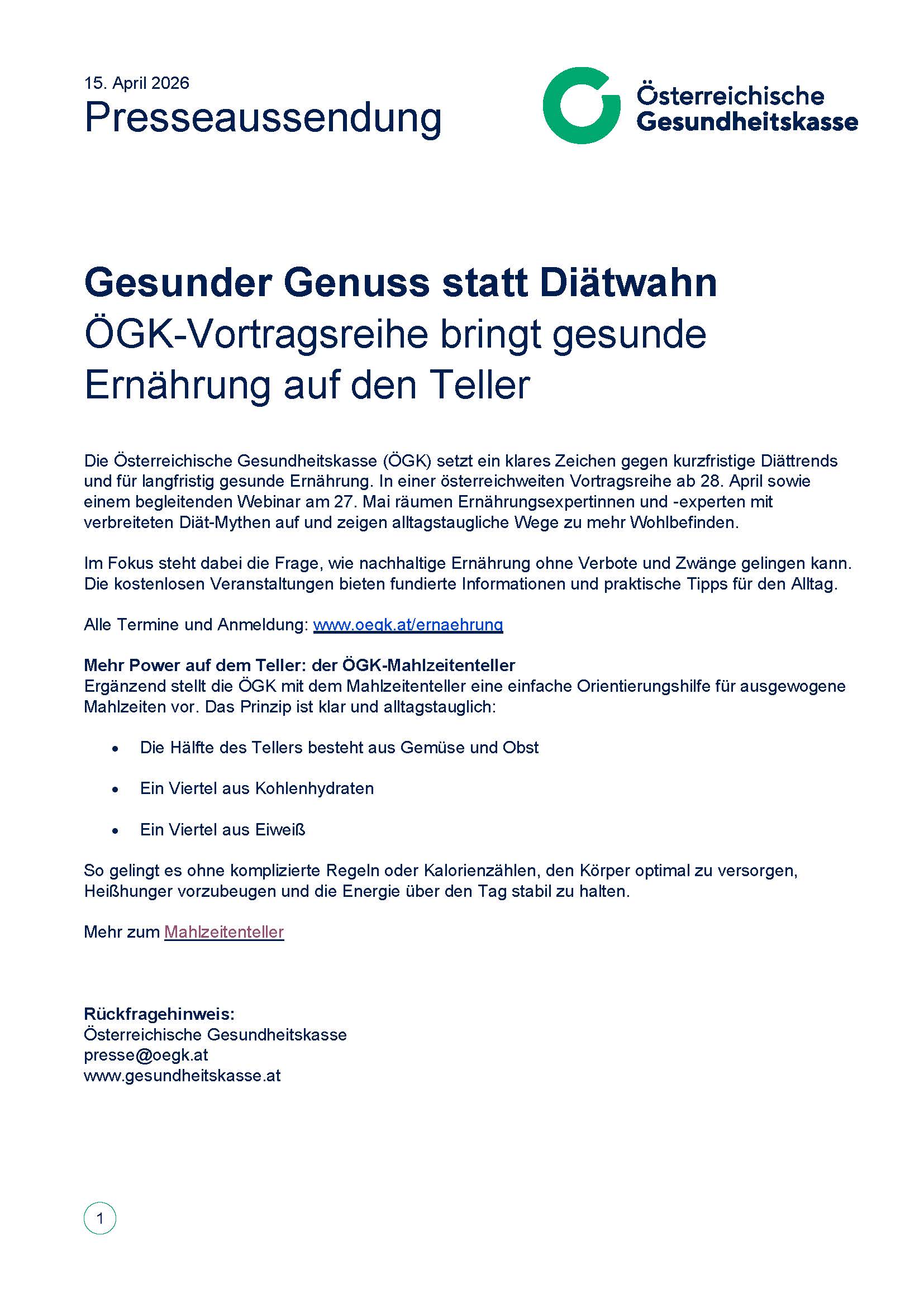 Gesunder Genuss statt Diätwahn ÖGK-Vortragsreihe bringt gesunde Ernährung auf den Teller