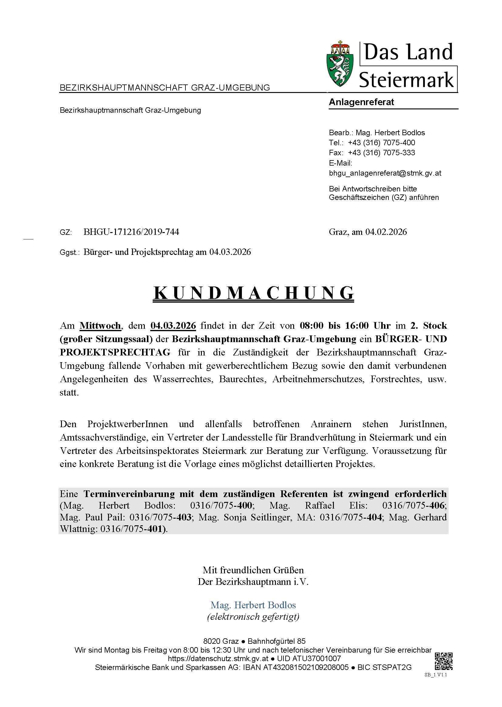 Am Mittwoch, dem 04.03.2026 findet in der Zeit von 08:00 bis 16:00 Uhr im 2. Stock (großer Sitzungssaal) der Bezirkshauptmannschaft Graz-Umgebung ein BÜRGER- UND PROJEKTSPRECHTAG für in die Zuständigkeit der Bezirkshauptmannschaft Graz-Umgebung fallende Vorhaben mit gewerberechtlichem Bezug sowie den damit verbundenen Angelegenheiten des Wasserrechtes, Baurechtes, Arbeitnehmerschutzes, Forstrechtes, usw. statt.