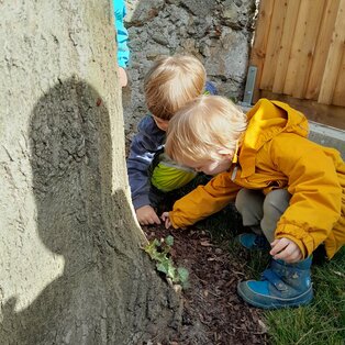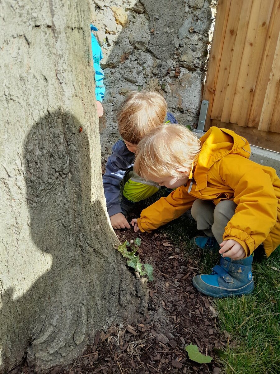 Kurz bevor wir mit der Jause fertig sind, hören wir aus dem Kinderzimmer bereits unser Aufräumlied. Wir essen noch gemütlich zu Ende und nachdem wir unseren Platz abgeräumt haben, gehen wir ins Kinderzimmer. Dort haben schon einige Kinder am großen Teppich Platz genommen und warten gespannt welche Lieder wir heute wieder singen und was es noch alles zu staunen gibt. Mit unserem Abschluss Kreislied machen wir uns auf den Weg in den Garten. Gemeinsam mit meinen Freunden schnappe ich mir ein Fahrzeug und entdecke den ganzen Garten. Juhu, wir dürfen pritscheln, schnell ziehen wir uns unsere Schuhe aus und hüpfen in die Sandkiste. Bei uns gibt’s wirklich immer etwas zu entdecken. Nanu, mir knurrt schon der Magen. Zum Glück geht es jetzt zum Mittagessen.