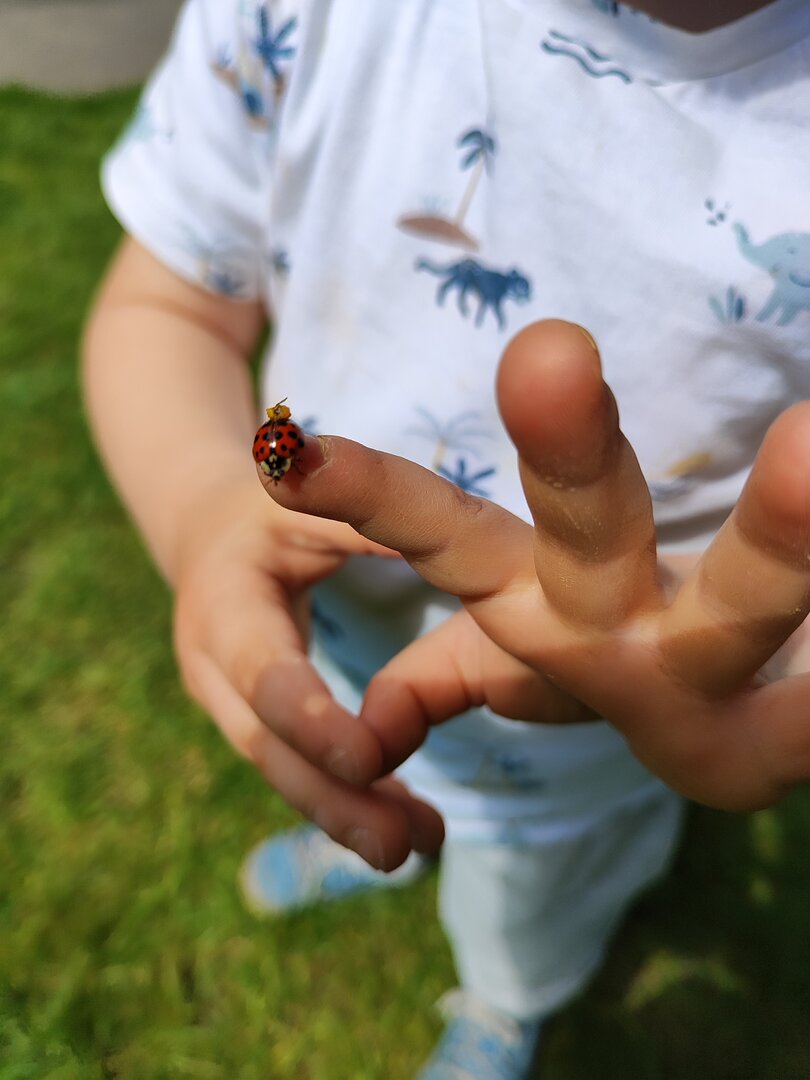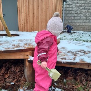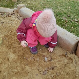 Kurz bevor wir mit der Jause fertig sind, hören wir aus dem Kinderzimmer bereits unser Aufräumlied. Wir essen noch gemütlich zu Ende und nachdem wir unseren Platz abgeräumt haben, gehen wir ins Kinderzimmer. Dort haben schon einige Kinder am großen Teppich Platz genommen und warten gespannt welche Lieder wir heute wieder singen und was es noch alles zu staunen gibt. Mit unserem Abschluss Kreislied machen wir uns auf den Weg in den Garten. Gemeinsam mit meinen Freunden schnappe ich mir ein Fahrzeug und entdecke den ganzen Garten. Juhu, wir dürfen pritscheln, schnell ziehen wir uns unsere Schuhe aus und hüpfen in die Sandkiste. Bei uns gibt’s wirklich immer etwas zu entdecken. Nanu, mir knurrt schon der Magen. Zum Glück geht es jetzt zum Mittagessen.