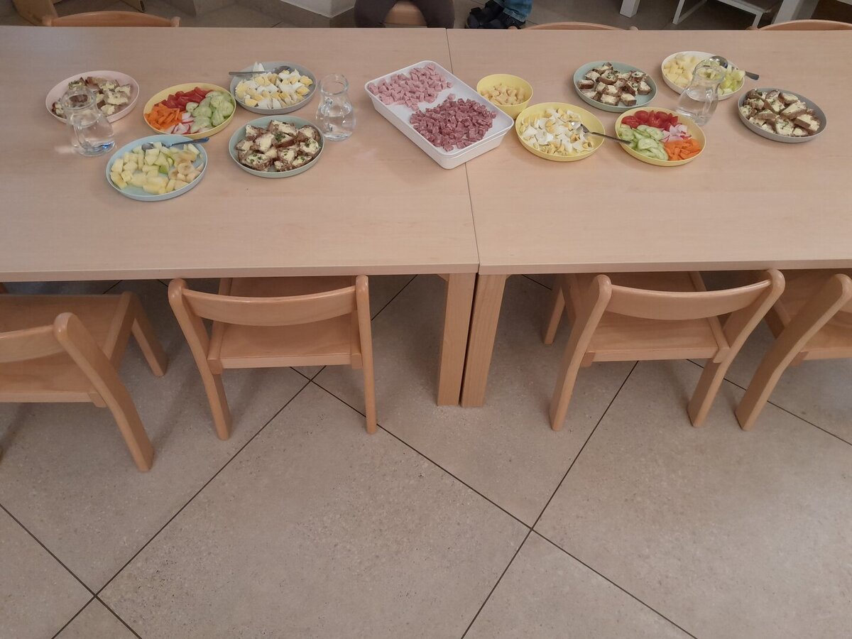 Sie können bei den Vorbereitungen aktiv mithelfen, indem sie zum Beispiel selbst einen Aufstrich anrühren oder Obst und Gemüse waschen, schneiden und anrichten. Dadurch erlernen die Kinder einerseits den richtigen Umgang mit Lebensmitteln und Arbeitsutensilien, sowie Küchenhygiene und andererseits wird die Feinmotorik geschult.