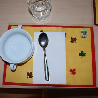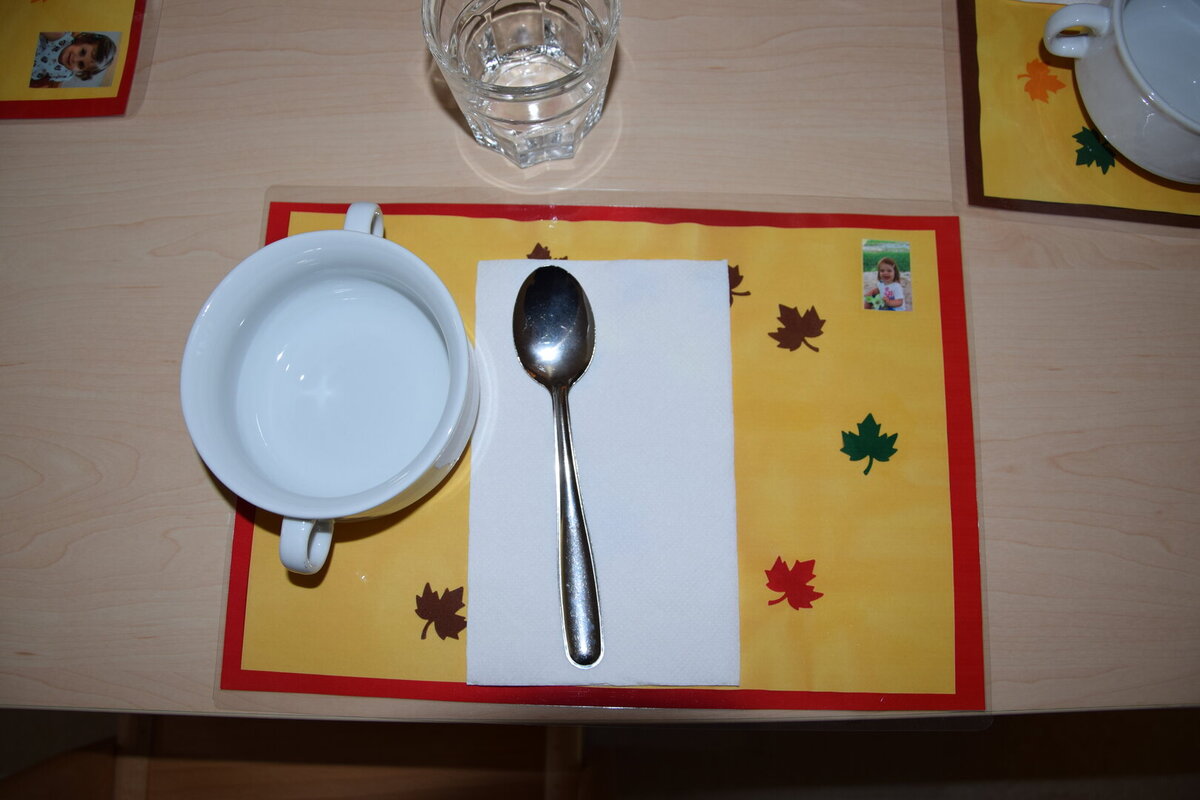 Außerdem stehen dort stets Wasserkrüge für die Kinder bereit. Jedes Kind hat sein eigenes Trinkglas, das auf einem Tablett steht.