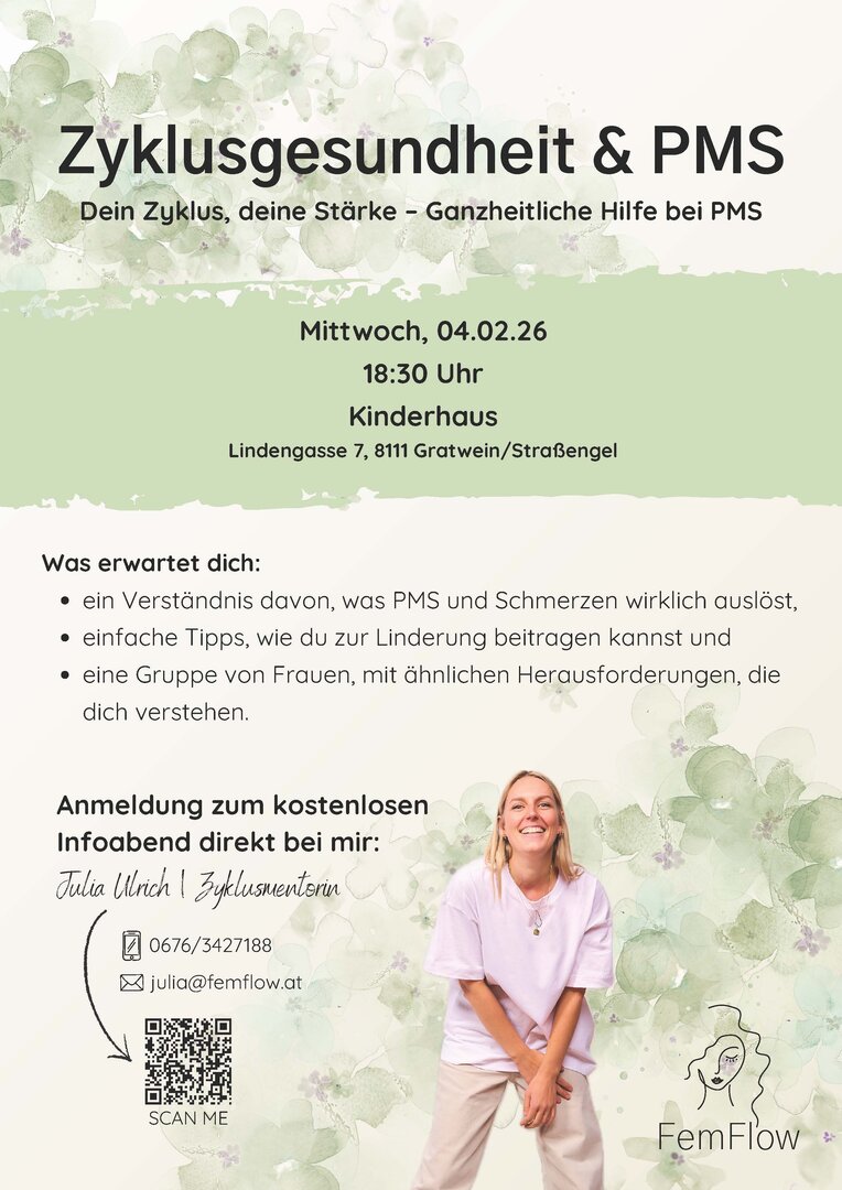 Anmeldung zum kostenlosen Infoabend direkt bei Julia Ulrich / Zyklusmentorin unter 0676/3427188 oder unter julia@femflow.at