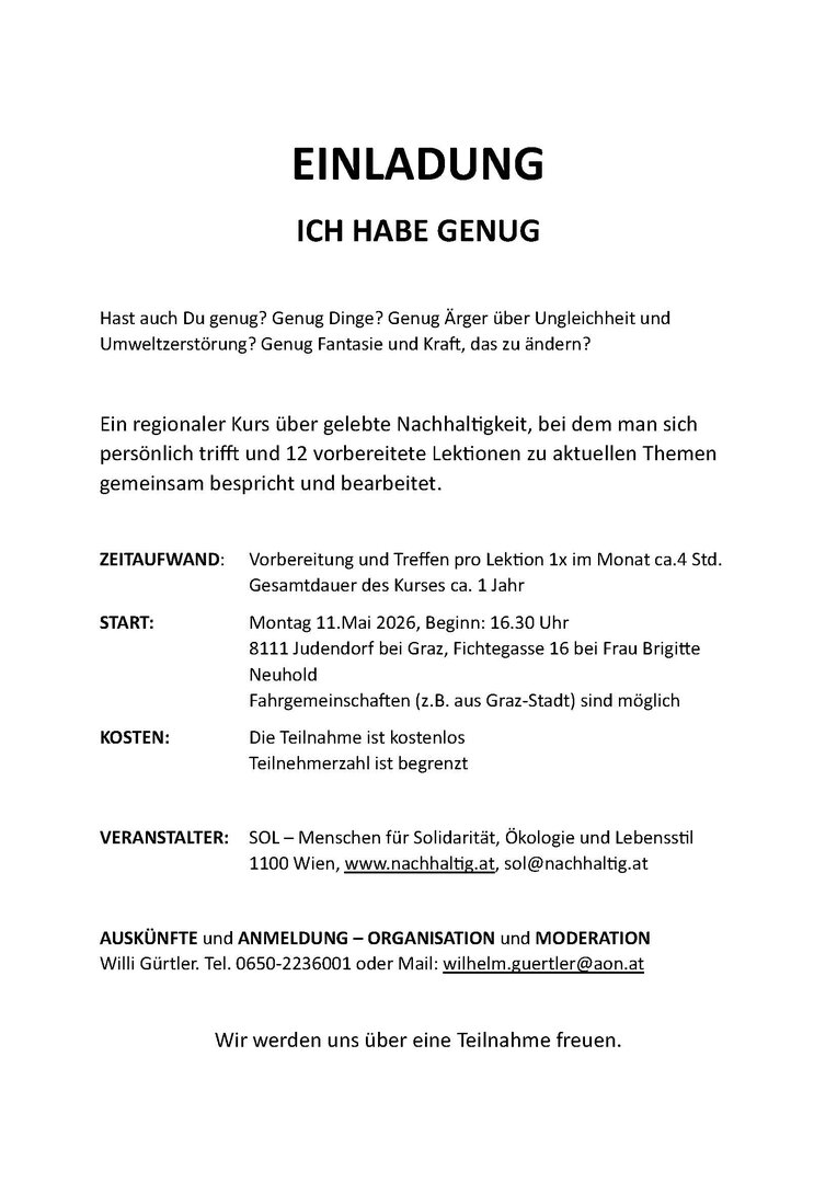 Hast auch Du genug? Genug Dinge? Genug Ärger über Ungleichheit und Umweltzerstörung? Genug Fantasie und Kraft, das zu ändern? Ein regionaler Kurs über gelebte Nachhaltigkeit, bei dem man sich persönlich trifft und 12 vorbereitete Lektionen zu aktuellen Themen gemeinsam bespricht und bearbeitet.