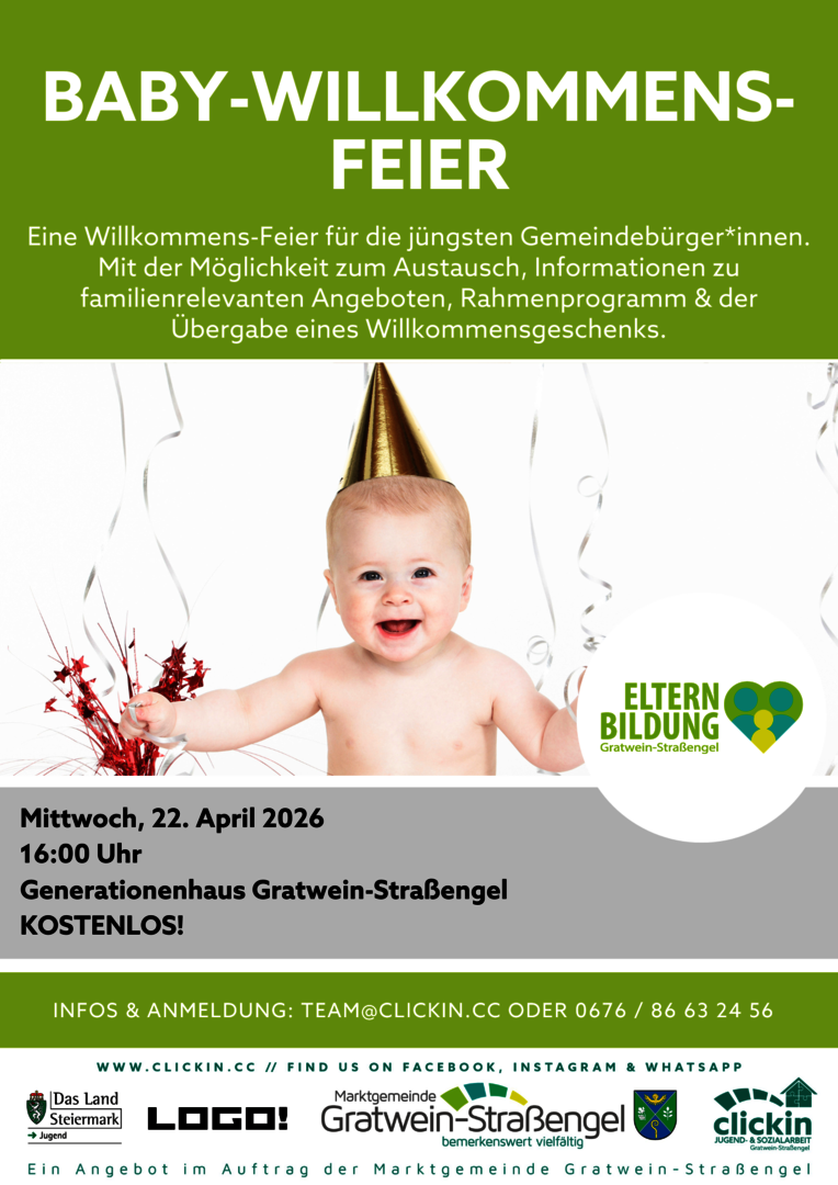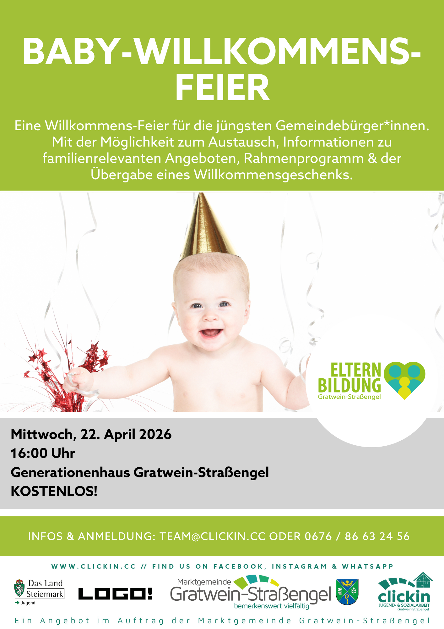 Eine Willkommens-Feier für die jüngsten Gemeindebürger*innen. Mit der Möglichkeit zum Austausch, Informationen zu familienrelevanten Angeboten, Rahmenprogramm & der Übergabe des Willkommensgeschenkes.