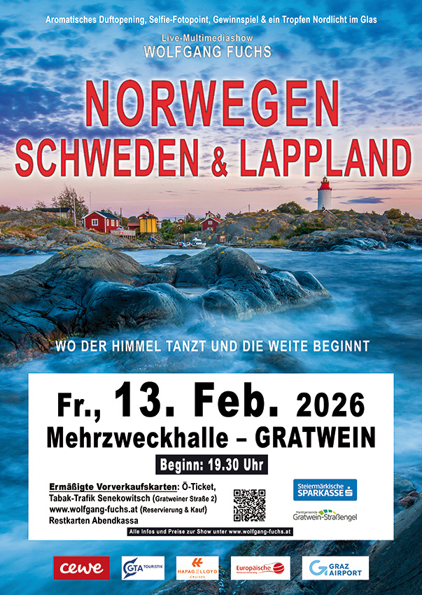 Norwegen - Schweden - Lappland: wild, schön und voller Kontraste. Von den Schären bis zum Nordkap, von Fjorden bis zu endlosen Fjells, von sturmumtosten Inseln bis zu malerischen Fischerdörfern. Sei es unter tanzendem Nordlicht oder im Zauber der Mitternachtssonne. In seiner aktuellen Multivision berichtet Wolfgang Fuchs von herausfordernden Husky Touren, Samen-Begegnungen und nordischen Eigenheiten – eine bildstarke Reise zwischen Natur, Abenteuer und Humor.