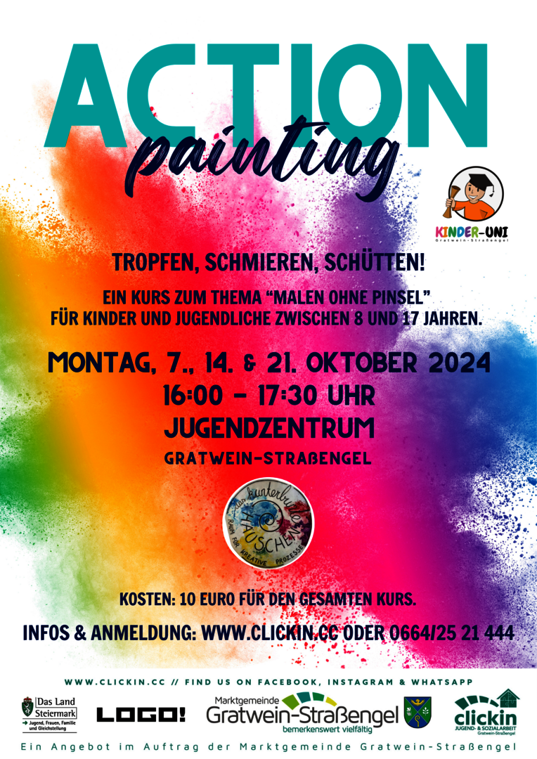 Im Oktober können Kinder und Jugendliche ihrer Kreativität freien Lauf lassen. Unter dem Motto „Tropfen, Schmieren und Schütten“ werden bei der KinderUNI im Oktober kunstvolle Bilder geschaffen und das ganz ohne Pinsel! Unter der Anleitung von Künstlerin Monika Penz können die Teilnehmer*innen ihre eigenen, einzigartigen Meisterwerke kreieren. Der Kurs richtet sich an Kinder und Jugendliche ab ca. 8 Jahren. Kosten: 10 Euro.